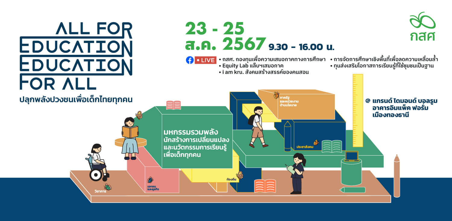 งานมหกรรม ALL FOR EDUCATION EDUCATIONFOR ALL รวมพลังนักสร้างการเปลี่ยนแปลง และนวัตกรรมการเรียนรู้เพื่อเด็กทุกคน ชวนติดตามการนำเสนอตัวเปลี่ยนเกมเพื่อแก้ปัญหาความเหลื่อมล้ำ วันที่ 23- 25 สิงหาคม 2567 เวลา 9.30 – 16.00 น.