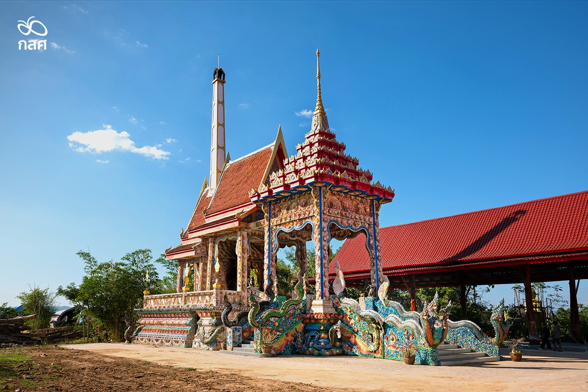 “ตอนแรกอาตมาทำปูนปั้นเองแบบโบราณ ทำแต่เช้าถึงห้าทุ่มตีหนึ่ง เหนื่อยมาก เลยคิดว่าถ้าทำคนเดียวคงไม่ไหว แล้วอาตมาเห็นหอยแครงที่ฝังดินอยู่มาสิบกว่าปีมันยังทน เลยนึกถึงเจดีย์หอยที่นครปฐม คิดว่าเอาเปลือกหอยมาประดับคงไม่ผิด จึงบอกโยมในหมู่บ้าน ใครมีเปลือกหอยล้างแล้วเอามา ตอนแรกติดเป็นเกล็ดพญานาค ใช้ปูนกาวแปะ เด็กนักเรียนเลิกเรียนก็มาช่วย พระเณรก็ช่วยกัน ทำมาเรื่อยๆ ตั้งแต่ปี 2557 ประมาณสิบเอ็ดปีแล้ว”