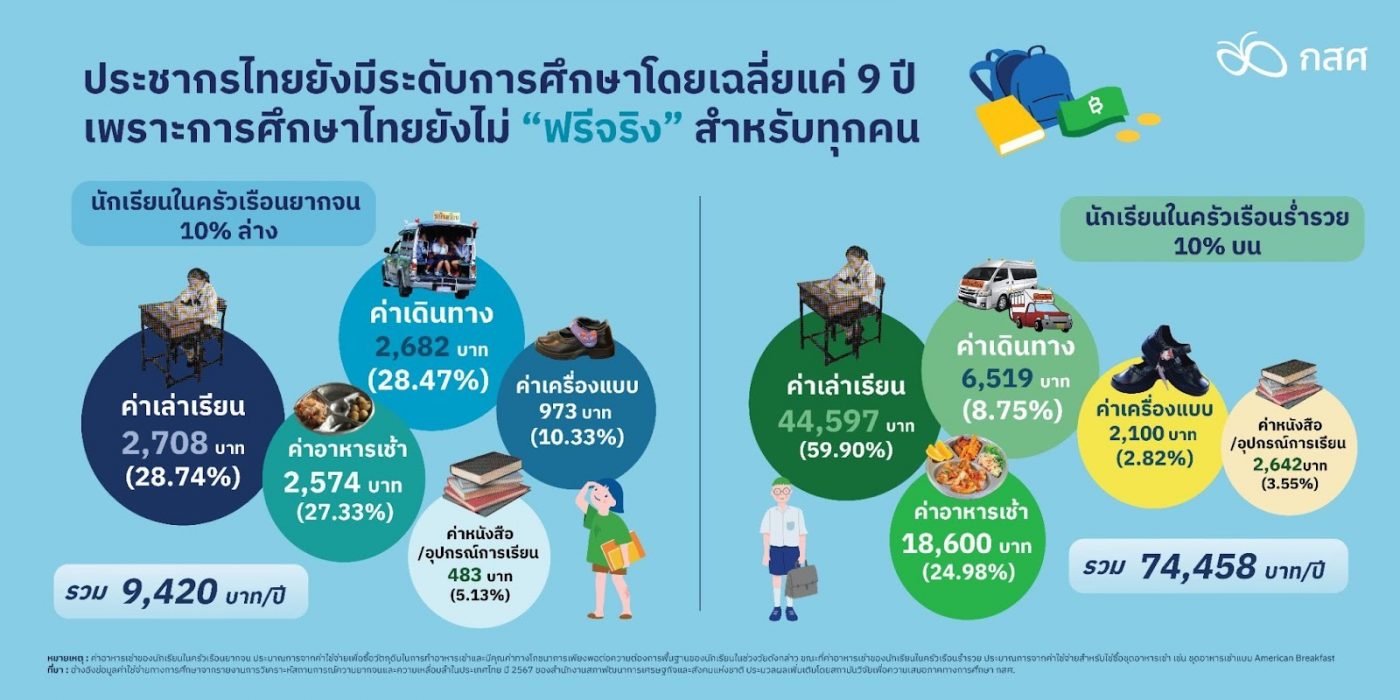 แม้ “การเรียนฟรี” จะเป็นนโยบายที่ถูกพูดถึงในทุกการเลือกตั้ง แต่ข้อมูลของ กสศ. สะท้อนชัดว่าความเหลื่อมล้ำด้านการศึกษายังคงฝังอยู่ในระบบ ทั้งที่ประเทศไทยมีนโยบายเรียนฟรี 15 ปีมากว่า 20 ปี  แต่คนไทยยังมีจำนวนปีที่ได้รับการศึกษาเฉลี่ยเพียง 9 ปี และครัวเรือนยากจนที่สุด 10% ยังต้องแบกรับค่าใช้จ่ายด้านการศึกษาเพิ่มเติมเฉลี่ย 9,420 บาทต่อคนต่อปี ซึ่งเป็นหนึ่งในสาเหตุสำคัญที่ทำให้เด็กหลุดออกจากระบบการศึกษา