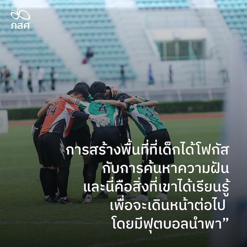 “การทำงานของ กสศ. และผู้ใหญ่ที่ลำปางหลวง ทำให้ผมมั่นใจ ว่า ‘สนามฟุตบอลจะเป็นโรงเรียนของเด็ก ๆ ได้’ เพราะมันพิสูจน์แล้วว่าการสร้างพื้นที่ที่เด็กได้โฟกัสกับการค้นหาความฝัน ได้อยู่กับสิ่งที่รักที่สนใจซึ่งโยงใยอยู่กับชีวิตตลอดเวลา มันจะเป็นหลักสูตรที่ทำให้เขาเข้าถึงแก่นแท้ของฟุตบอล แล้วมันไม่ได้หมายถึงว่าทุกคนต้องมีปลายทางที่การเล่นอาชีพหรือติดทีมชาติ แต่มันยังมีฝันมีเส้นทางอื่นที่รายล้อม ที่วันหนึ่งเด็ก ๆ เหล่านี้อาจโตไปเป็นโค้ชฟุตบอล เป็นโค้ชฟิตเนส เป็นนักโภชนาการ เป็นนักกายภาพบำบัด หรืออาชีพใด ๆ ก็ตามที่เกี่ยวข้องกับฟุตบอล และนี่คือสิ่งที่เขาได้เรียนรู้เพื่อจะเดินหน้าต่อไป โดยมีฟุตบอลนำพา”