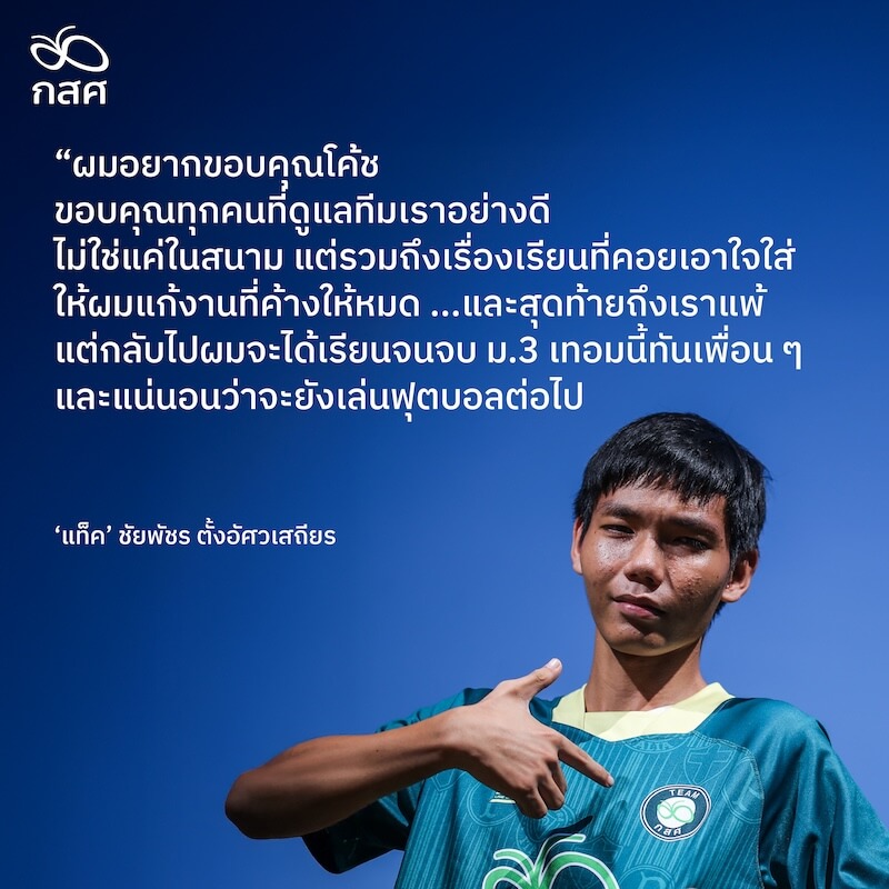 แทคทิ้งท้ายว่า “ผมอยากขอบคุณโค้ช ขอบคุณทุกคนที่ดูแลทีมเราอย่างดี ไม่ใช่แค่ในสนาม แต่รวมถึงเรื่องเรียนที่คอยเอาใจใส่ให้ผมแก้งานที่ค้างให้หมด …และสุดท้ายถึงเราแพ้ แต่กลับไปผมจะได้เรียนจนจบ ม.3 เทอมนี้ทันเพื่อน ๆ และแน่นอนว่าจะยังเล่นฟุตบอลต่อไป