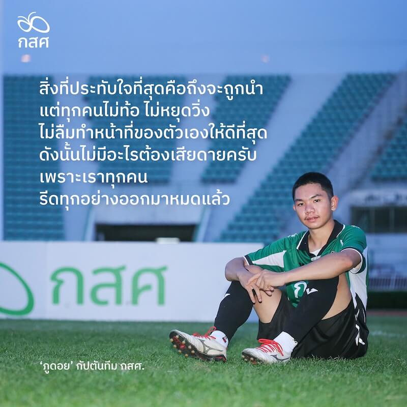 “เพราะถ้าย้อนถึงตอนแรก ๆ ที่ตั้งทีม พวกเราแพ้มาเยอะแยะมากมายครับ บางนัดโดนยิงเป็นสิบลูก แต่พอวันถัดมาเราก็ได้แต่คิดกันว่าอยากกลับไปแข่ง กลับไปทำให้ดีขึ้น แล้วพวกเราก็ค่อย ๆ แพ้น้อยลง จนบางนัดเริ่มมีเสมอ มีชนะ มันก็ช่วยให้เชื่อมั่นว่าพวกเราก็ทำได้ ส่วนนัดนี้ถึงจะแพ้ แต่เรารู้กันครับว่ากว่าจะมาถึงตรงนี้แต่ละคนต้องผ่านอะไรมาบ้าง นี่ถึงเป็นสิ่งที่เราทุกคนพูดได้ ว่าพวกเราภูมิใจครับ