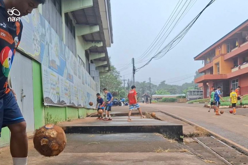 เด็ก ๆ โรงเรียนทองผาภูมิวิทยายังไม่มีสนามฟุตบอลในโรงเรียน ต้องไปใช้สนามเทศบาล แม้โรงเรียน ชุมชน และวัดจะช่วยดูแล แต่ก็ยังขาดอุปกรณ์พื้นฐาน เช่น ลูกฟุตบอลและรองเท้า ซึ่งต้องรอการบริจาคจากผู้ใหญ่ใจดี