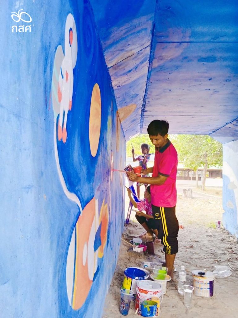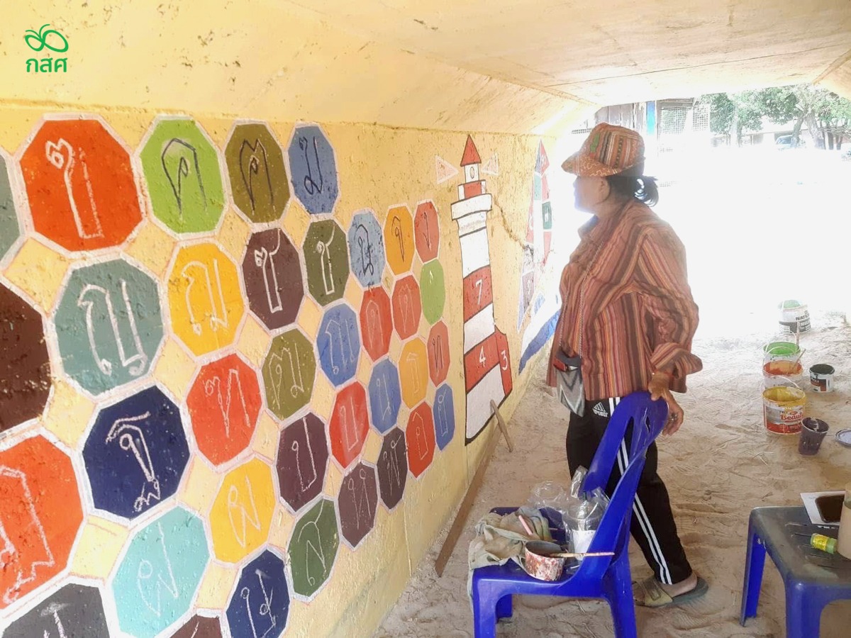 ชาวบ้านและคุณครูช่วยกันวาดภาพ และตัวอักษรสีสันสดใสให้เด็กๆ อ่านเล่น
