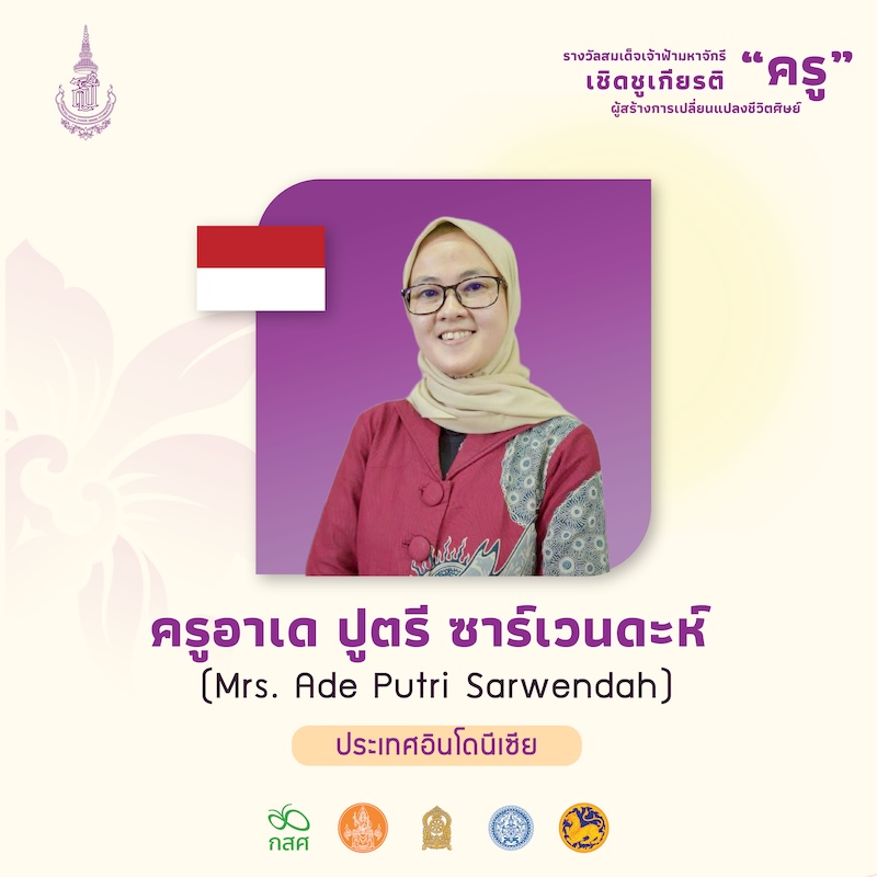 - ครูอาเด ปูตรี ซาร์เวนดะห์ (Mrs. Ade Putri Sarwendah) : ประเทศอินโดนีเซีย
