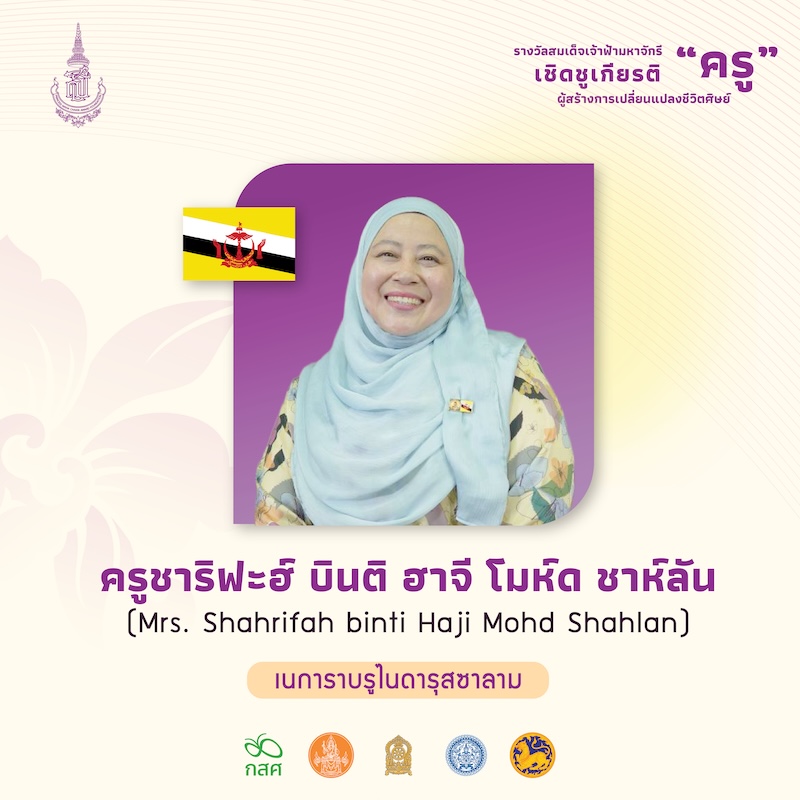 - ครูชาริฟะฮ์ บินติ ฮาจี โมห์ด ชาห์ลัน (Mrs. Shahrifah binti Haji Mohd Shahlan) : เนการาบรูไนดารุสซาลาม