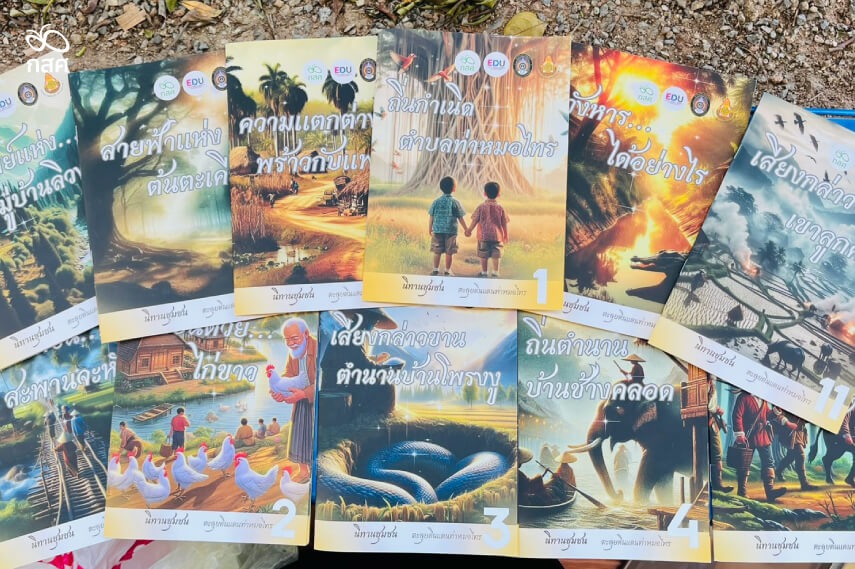 “มีงานหนึ่งที่เริ่มทำตั้งแต่มาฝึกสอน คือปรับปรุงห้องสมุดโรงเรียน อยากทำให้ดี ๆ ให้เด็ก ๆ อยากเข้า แล้วแอบคิดด้วยว่าถ้าเป็นพื้นที่ที่คนในชุมชนมาอาศัยเรียนรู้ได้ก็ยิ่งดีมาก ๆ เราจึงหาแนวร่วมหน่วยงานที่ให้ทุนและบริจาคหนังสือ แล้วเรายังผลิตสื่อเองด้วย โดยรับโจทย์จากผู้นำชุมชน จนได้ ‘ชุดนิทานชุมชน’ สิบเอ็ดเล่ม ที่บันทึกประวัติความเป็นมาของสิบเอ็ดหมู่บ้านของเราไว้ และตีพิมพ์เป็นรูปเล่มเรียบร้อย ส่วนห้องสมุดก็เริ่มเป็นรูปร่าง …แต่พอน้ำมาทีเดียว กลายเป็นว่าตอนนี้หนังสือเล่มเดียวก็ไม่เหลือแล้วค่ะ”