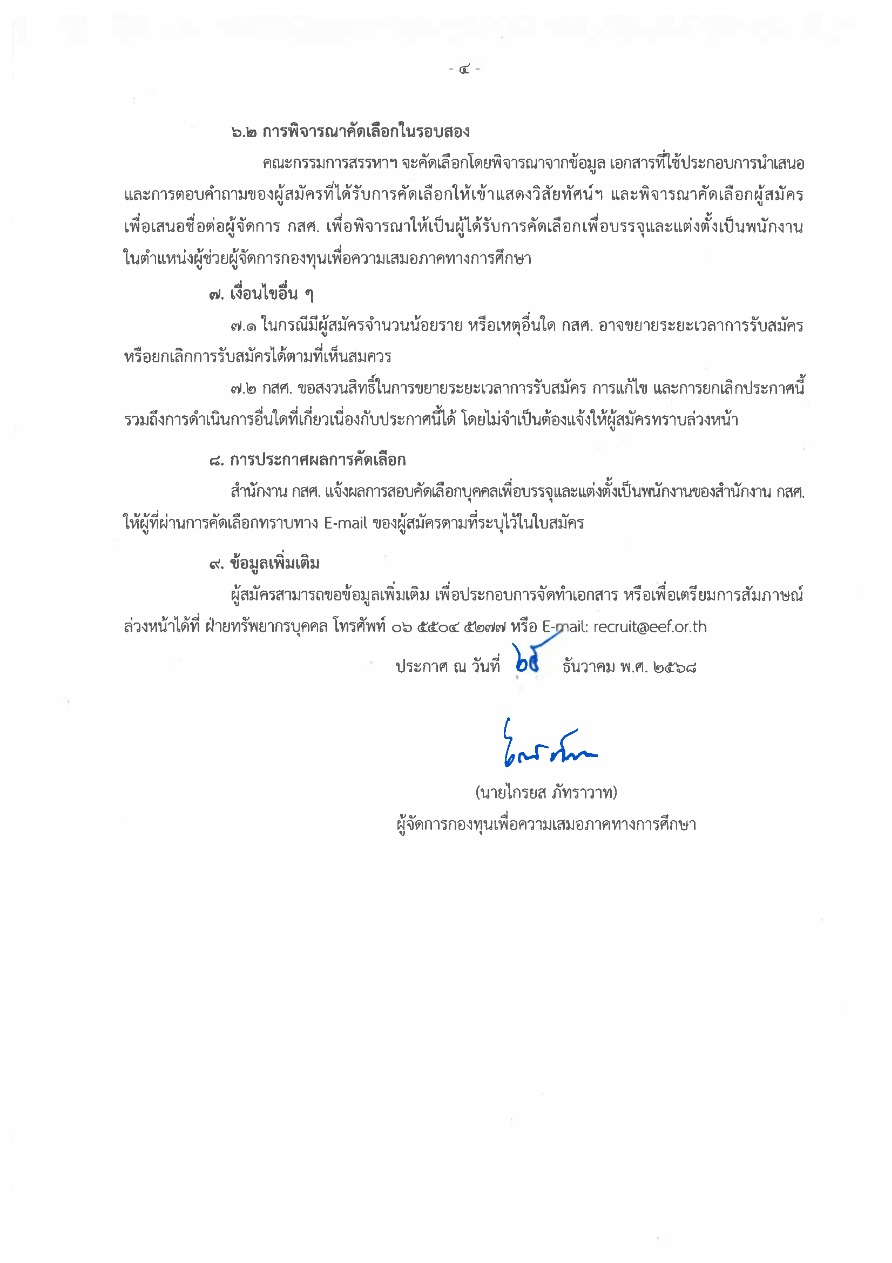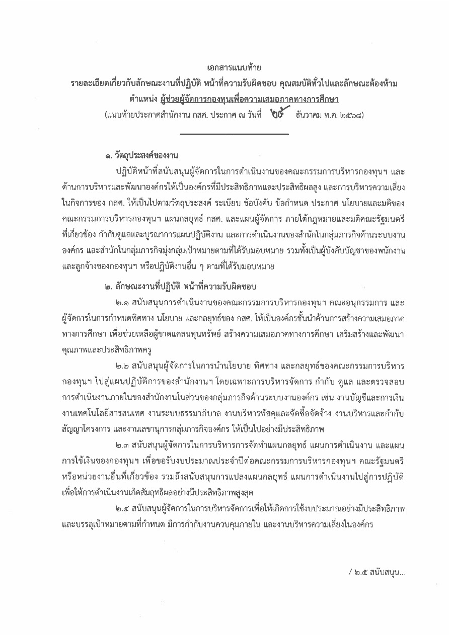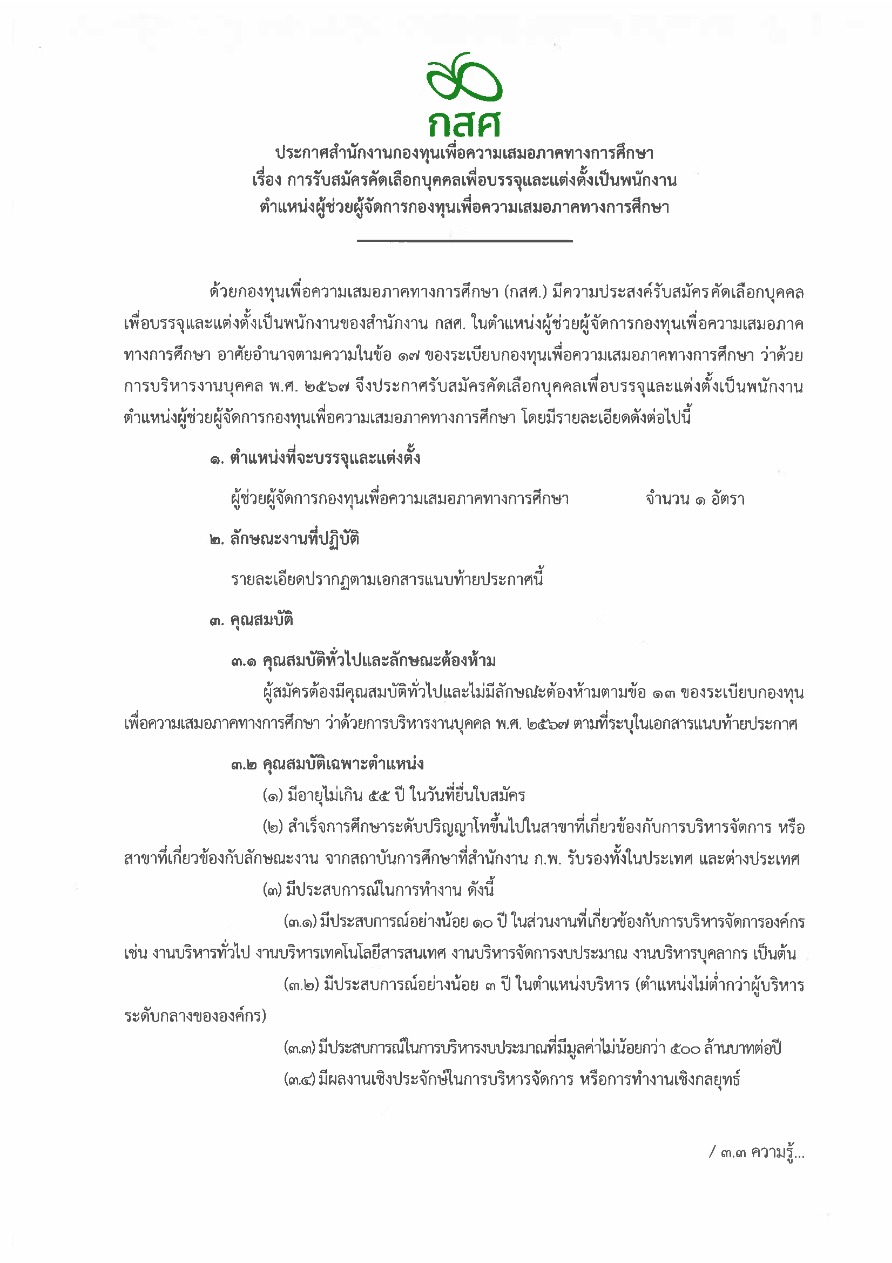 ด้วยกองทุนเพื่อความเสมอภาคทางการศึกษา (กสศ.) มีความประสงค์รับสมัครคัดเลือกบุคคลเพื่อบรรจุและแต่งตั้งเป็นพนักงาน ตำแหน่งผู้ช่วยผู้จัดการกองทุนเพื่อความเสมอภาคทางการศึกษา อาศัยอำนาจตามความในข้อ ๑๗ ของระเบียบกองทุนเพื่อความเสมอภาคทางการศึกษา ว่าด้วยการบริหารงานบุคคล พ.ศ. ๒๕๖๗ จึงประกาศรับสมัครคัดเลือกบุคคลเพื่อบรรจุและแต่งตั้งเป็นพนักงานตำแหน่งผู้ช่วยผู้จัดการกองทุนเพื่อความเสมอภาคทางการศึกษา โดยมีรายละเอียดดังต่อไปนี้