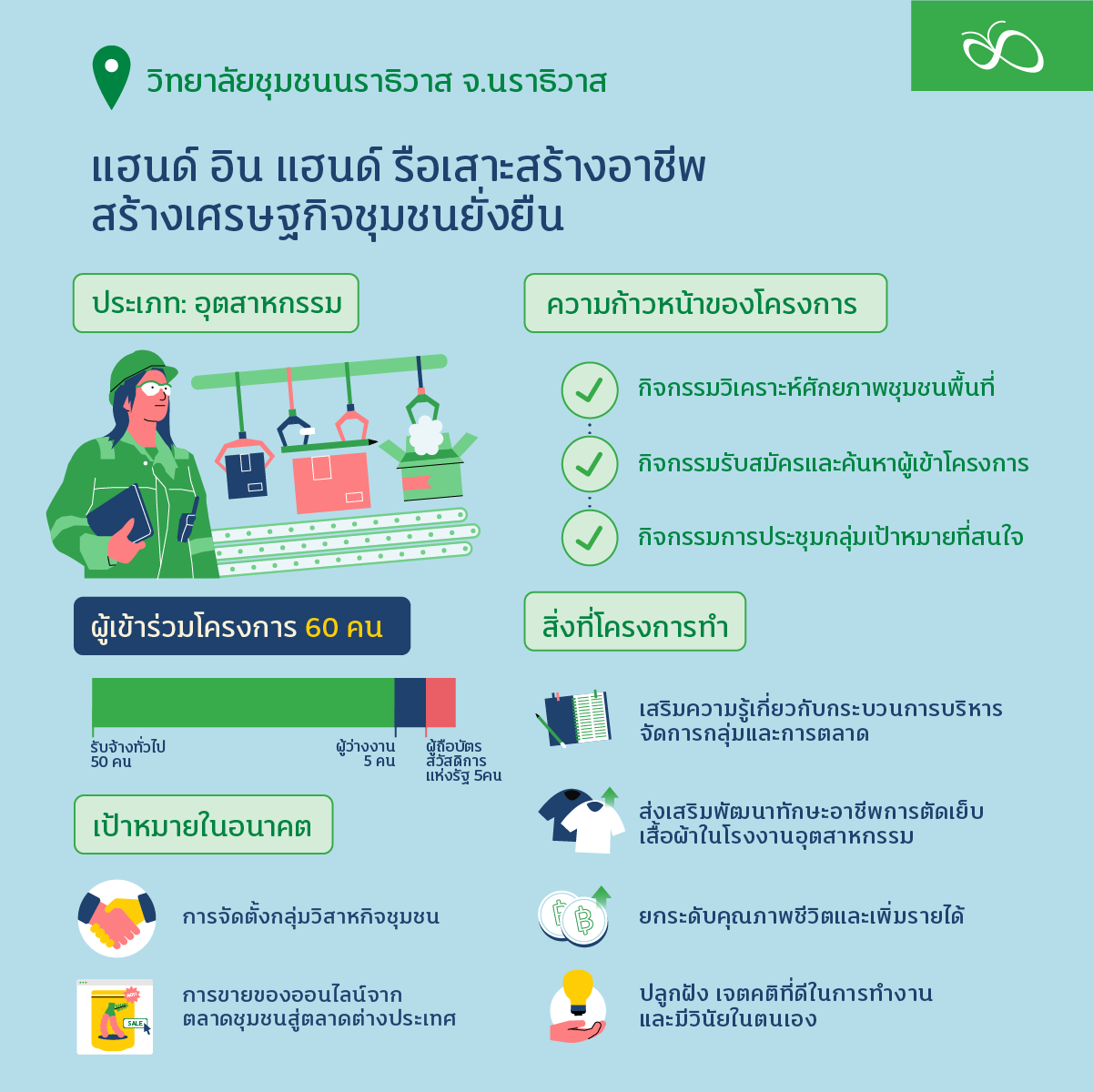 วิทยาลัยชุมชนนราธิวาส คือหน่วยงานพัฒนาอาชีพในจังหวัดนราธิวาสที่มีการทำงานร่วมกับชุมชนอย่างต่อเนื่อง โดยโครงการล่าสุดที่วิทยาลัยชุมชนได้จัดขึ้นคือโครงการ ‘แฮนด์ อิน แฮนด์ รือเสาะสร้างอาชีพ สร้างเศรษฐกิจชุมชนยั่งยืน’ ซึ่งมีที่มาจากการที่อำเภอรือเสาะมีต้นทุนทางอาชีพอย่าง ‘โรงงานแฮนอินแฮน’ ซึ่งเป็นโรงงานผลิตเสื้อผ้าที่มีความต้องการในการจ้างแรงงานฝีมือจำนวนมาก