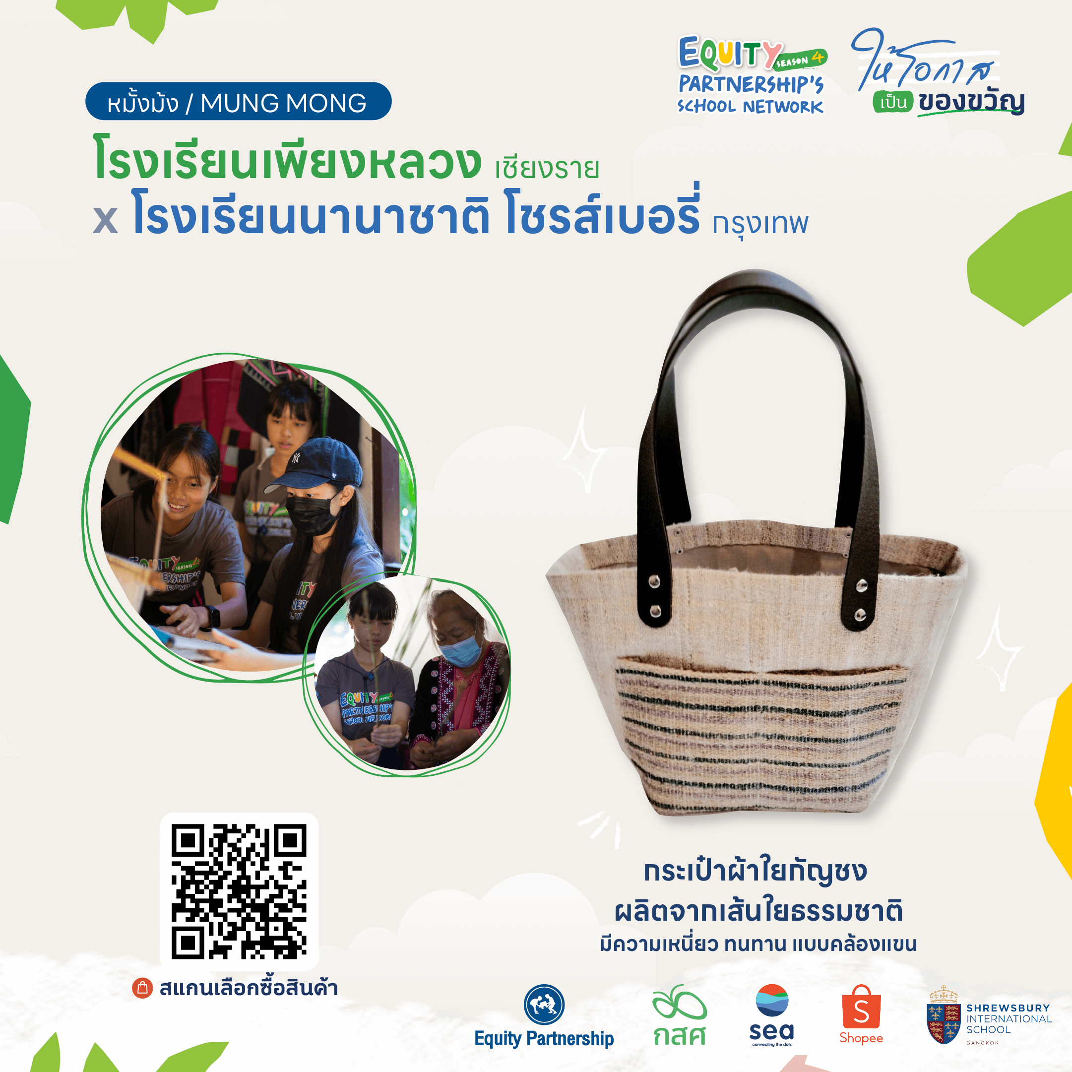 กระเป๋าผ้าใยกัญชง ผลิตจากเส้นใยธรรมชาติ มีความเหนี่ยว ทนทาน แบบคล้องแขน ตัวกระเป๋ากว้าง 7 นิ้ว สูง 8 นิ้ว สายกระเป๋าหนัง PVC สีน้ำตาลกระเป๋ามี 2 สี : ผ้าทอสีพื้น, ผ้าทอลาย