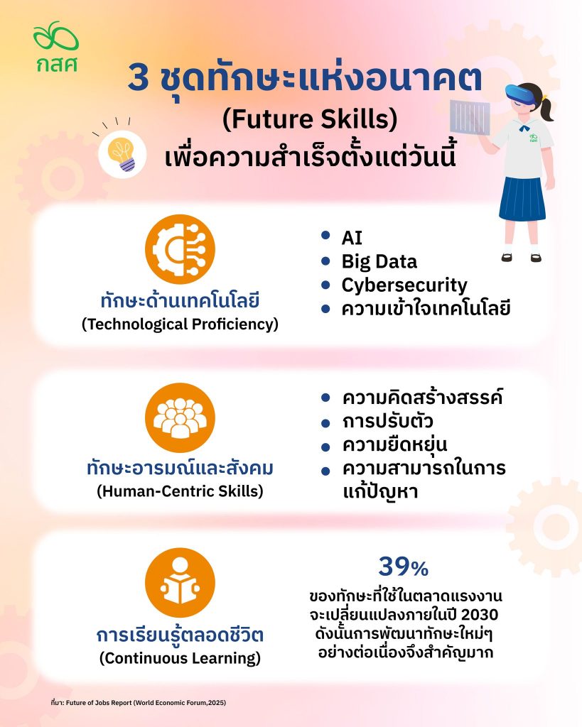 ในงาน อว.แฟร์ 2025 ดร.ไกรยส ภัทราวาท ผู้จัดการ กสศ. ได้เปิดมุมมองจากรายงาน Future of Jobs Report 2025 ของ World Economic Forum ว่า 3 ชุดทักษะแห่งอนาคต (Future Skills) คือกุญแจสำคัญที่อาจช่วย “การันตีความสำเร็จ” ในโลกการทำงานยุคนี้