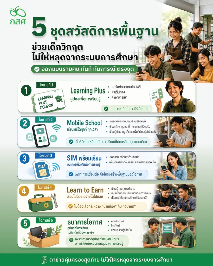 ที่ประชุมคณะทำงานพัฒนานวัตกรรมการช่วยเหลือเด็กและเยาวชนในภาวะวิกฤตการศึกษา กองทุนเพื่อความเสมอภาคทางการศึกษา (กสศ.) จึงมีมติเห็นชอบจัด “ชุดสวัสดิการพื้นฐานสำหรับเด็กและเยาวชนในภาวะวิกฤตการศึกษา” ตาข่ายสุดท้ายเพื่อปกป้องไม่ให้เด็กและเยาวชนหลุดจากระบบการศึกษา ประกอบด้วย “5 โอกาส” ดังนี้
