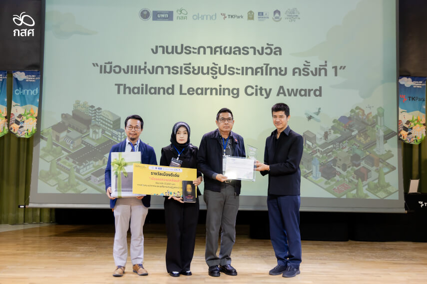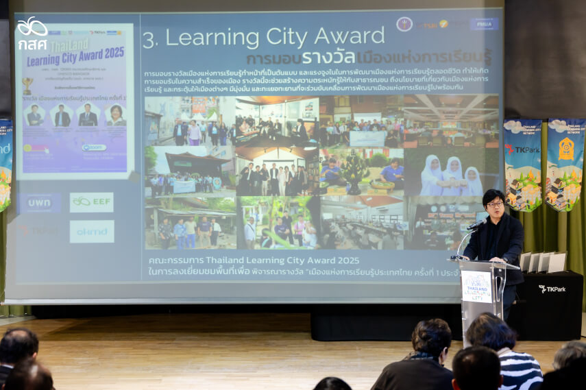 เมื่อวันที่ 31 ตุลาคม 2568 เครือข่ายเมืองแห่งการเรียนรู้ประเทศไทย ภายใต้ความร่วมมือระหว่างหน่วยบริหารและจัดการทุนด้านการพัฒนาระดับพื้นที่ (บพท.), กองทุนเพื่อความเสมอภาคทางการศึกษา (กสศ.), สำนักงานบริหารและพัฒนาองค์ความรู้ (สบร.), กับ องค์การการศึกษา วิทยาศาสตร์ และวัฒนธรรมแห่งสหประชาชาติ (ยูเนสโก) ประจำประเทศไทย จัดงานมอบ “รางวัลเมืองแห่งการเรียนรู้ประเทศไทย” (Thailand Learning City Award) ณ ลานสานฝัน อุทยานการเรียนรู้ Thailand Knowledge Park หรือ TK Park เพื่อยกย่องเมืองต้นแบบที่ขับเคลื่อนการเรียนรู้ตลอดชีวิต 16 แห่ง และสร้างแรงบันดาลใจให้เมืองอื่นพัฒนาตนเองอย่างยั่งยืน โดยมีตัวแทนหน่วยงานด้านการศึกษาทั้งระดับชาติและนานาชาติ รวมถึงตัวแทนเมืองแห่งการเรียนรู้เข้าร่วมอย่างคับคั่ง