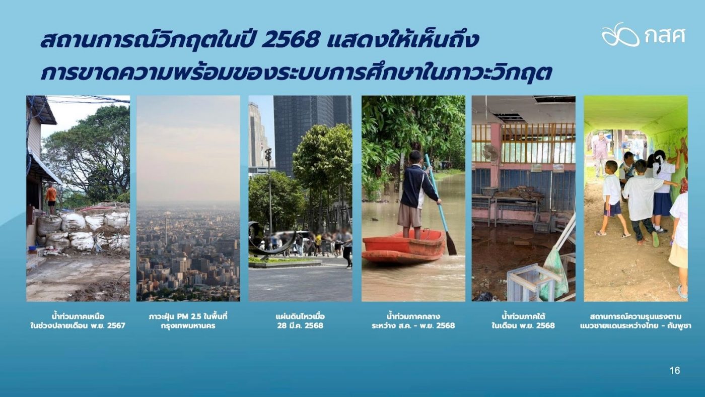 ดร.ไกรยส ภัทราวาท ผู้จัดการ กสศ. เปิดเผยว่า ประเทศไทยกำลังยืนอยู่บนปากเหวของการเปลี่ยนผ่านที่สำคัญที่สุดในรอบ 4 ทศวรรษ เราติดอยู่ในกับดักรายได้ปานกลางและกับดักความยากจนข้ามรุ่นมายาวนาน อนาคตเรากำลังเผชิญวิกฤตโครงสร้างประชากร และวิกฤตการขาดทุนมนุษย์ที่ไม่เพียงพอทั้งในเชิงปริมาณ และเชิงคุณภาพ หรือ “วิกฤตซ้อนวิกฤต” (Perfect Storm หรือพายุลูกใหญ่) ที่จะทำให้ประเทศไทยและคนไทยไม่สามารถไปถึงเป้าหมายด้านต่าง ๆ ที่กำหนดไว้ร่วมกันได้