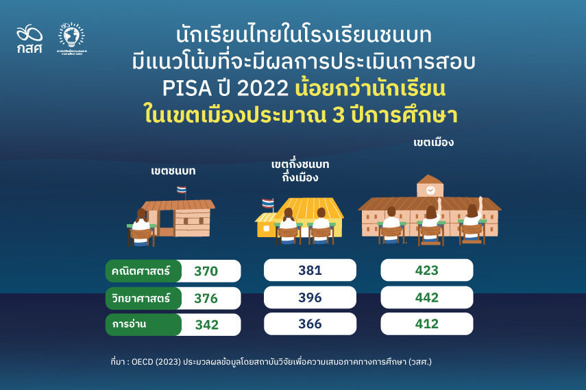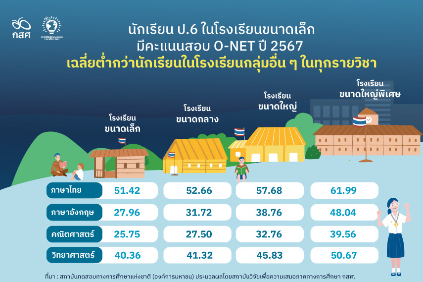 วิกฤต: นักเรียนในโรงเรียนขนาดเล็กมีคะแนนเฉลี่ย O-NET ต่ำกว่านักเรียนในโรงเรียนขนาดกลาง ขนาดใหญ่ และขนาดใหญ่พิเศษในทุกรายวิชาอย่างมีนัยสำคัญ และ กสศ. วิเคราะห์ข้อมูลผลการประเมินสมรรถนะนักเรียนมาตรฐานสากล (PISA) ในปี พ.ศ. 2565 พบว่าเด็กในชนบทมี “ทักษะวิทย์ คณิต และการอ่าน” ต่ำกว่าเด็กในเมืองกว่า 3 การศึกษา นอกจากนี้ จากการติดตามข้อมูลการเรียนต่อของนักเรียนจากครัวเรือนยากจนที่สุด 15% ของ กสศ. พบว่า ด็กยากจนมีโอกาสเรียนต่อมหาวิทยาลัยน้อยกว่าเด็กทั่วไปถึง 2.5 เท่า