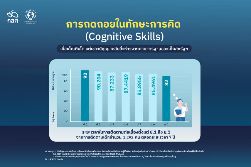วิกฤต: ยิ่งเรียน ยิ่ง IQ ลดลง งานวิจัยของ กสศ. ร่วมกับ RIPED มหาวิทยาลัยหอการค้าไทย โดยติดตามเด็กคนเดิมที่เข้าระบบการศึกษาตั้งแต่ระดับปฐมวัยจนถึงมัธยมศึกษา พบว่า เมื่อเด็กกลุ่มดังกล่าวเลื่อนระดับชั้นเรียนจากระดับประถมศึกษาปีที่ 1 ไปจนถึงระดับมัธยมศึกษาปีที่ 1 มีระดับเชาวน์ปัญญาที่ต่ำกว่าค่าเฉลี่ยของเด็กในสหรัฐอเมริกาในอายุนั้น ๆ ที่ 100 และมีแนวโน้มที่จะมีระดับเชาวน์ปัญญา (IQ) โดยเฉลี่ยต่ำกว่าค่าเฉลี่ยดังกล่าวมากยิ่งขึ้น แม้จะเป็นเด็กในระดับชั้นสูงขึ้น