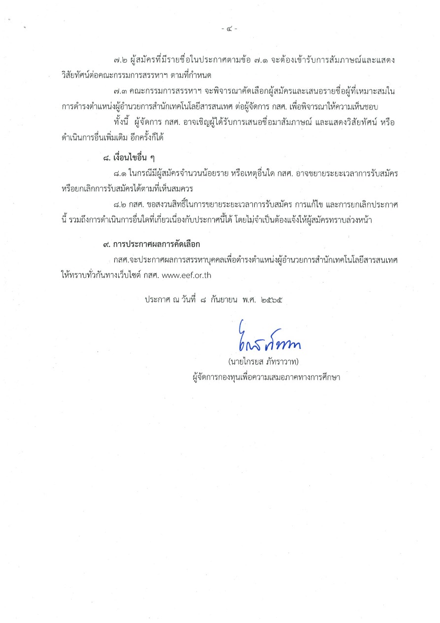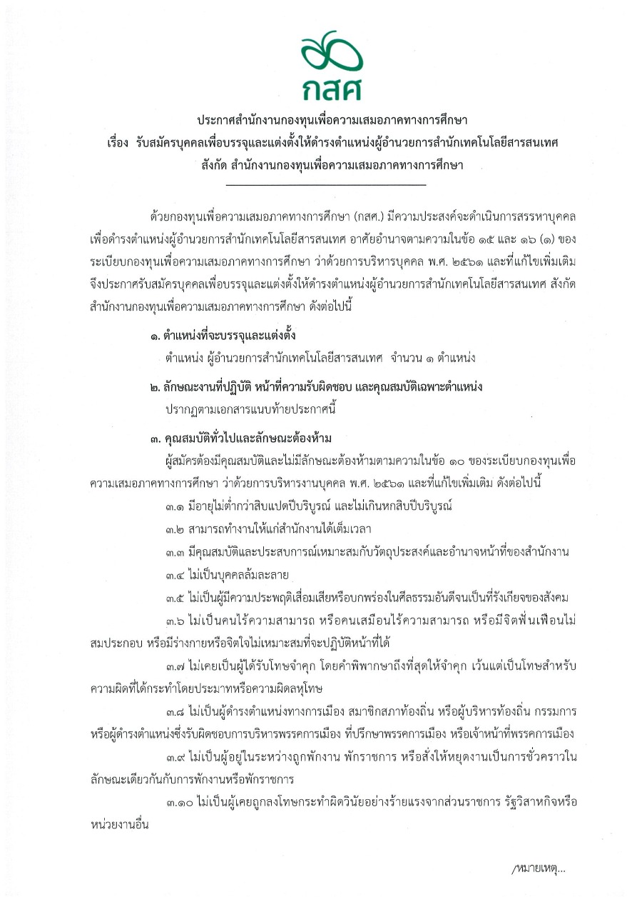 ประกาศสำนักงาน กสศ. เรื่อง รับสมัครบุคคลเพื่อบรรจุและแต่งตั้งให้ดำรงตำแหน่งผู้อำนวยการสำนักเทคโนโลยีสารสนเทศ ลงวันที่ 8 กันยายน 2565 รวมจำนวน 1 อัตรา ขั้นตอนการสมัครงาน ดาวน์โหลดใบสมัคร ยื่นใบสมัครพร้อมอัปโหลดเอกสารประกอบการสมัคร ส่งมาที่ recruit@eef.or.thช่องทางติดต่อ ฝ่ายทรัพยากรบุคคล 065 5045277 เอกสารสำหรับดาวน์โหลด ประกาศการรับสมัครสอบคัดเลือก กสศ.ประกาศ กสศ. ดาวน์โหลดใบสมัครใบสมัครงาน