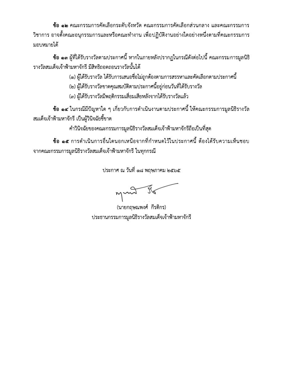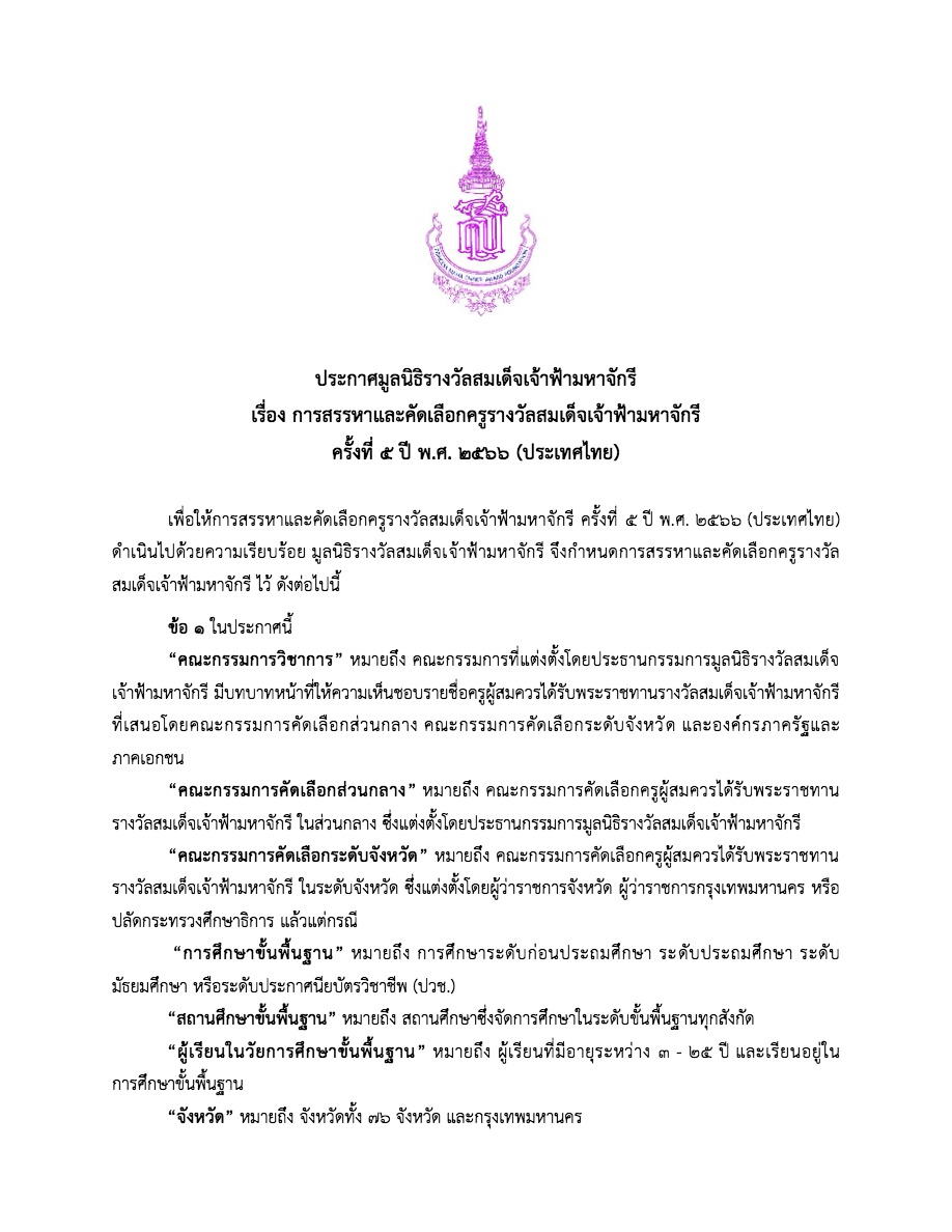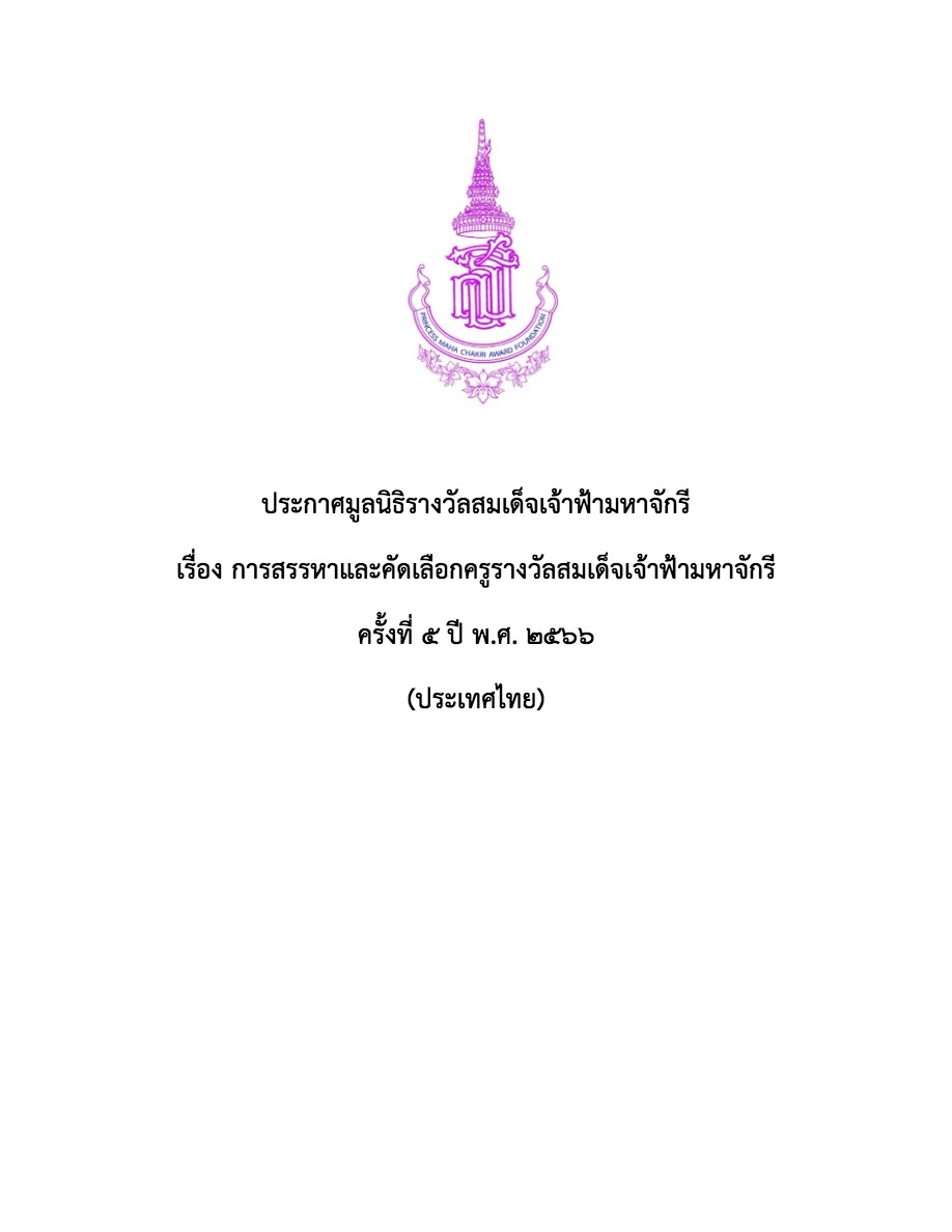 ประกาศมูลนิธิรางวัลสมเด็จเจ้าฟ้ามหาจักรี เรื่อง การสรรหาและคัดเลือกครูรางวัลสมเด็จเจ้าฟ้ามหาจักรีครั้งที่ ๕ ปี พ.ศ. ๒๕๖๖ (ประเทศไทย) ดาวน์โหลด