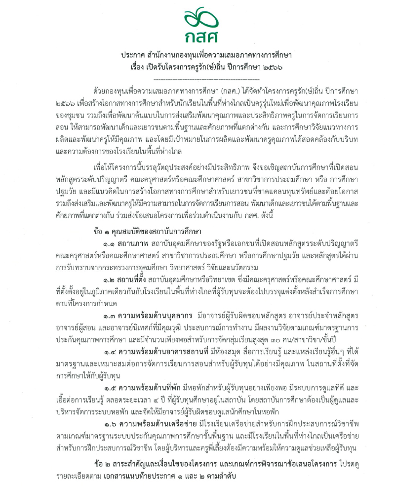 เปิดรับข้อเสนอโครงการครูรัก(ษ์)ถิ่น ปีการศึกษา 2566 เปิดรับข้อเสนอโครงการจากสถาบันอุดมศึกษาที่สนใจเข้าร่วมเป็นสถาบันผลิตและพัฒนาครู ดาวน์โหลดเอกสารที่เกี่ยวข้อง ประกาศเปิดรับโครงการ ฯ คลิกเอกสารแนบท้าย ๑ คลิกเอกสารแนบท้าย ๒ คลิกเอกสารแนบท้าย ๓ คลิก ส่งข้อเสนอโครงการ ฯ : คลิก ดาวน์โหลด
