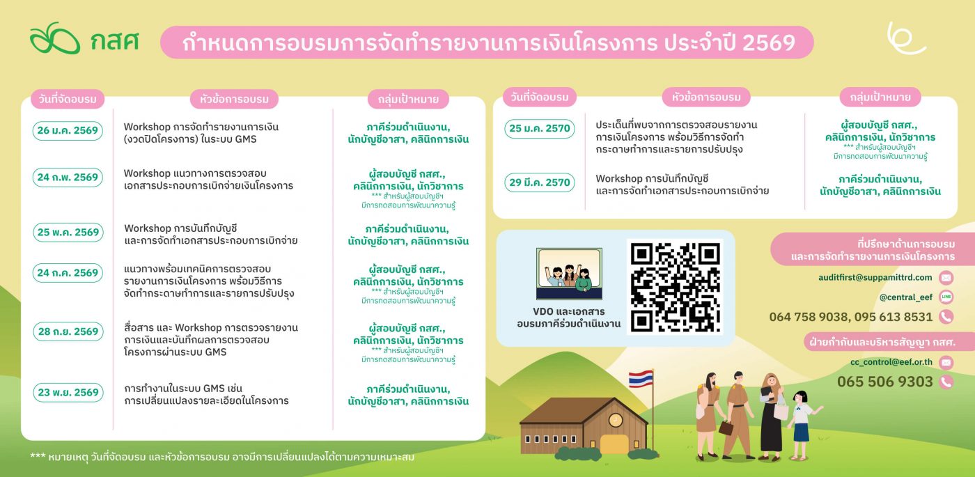 - Workshop แนวทางการตรวจสอบเอกสารประกอบการเบิกจ่ายเงินโครงการ วันที่ 24 กุมภาพันธ์ 2569